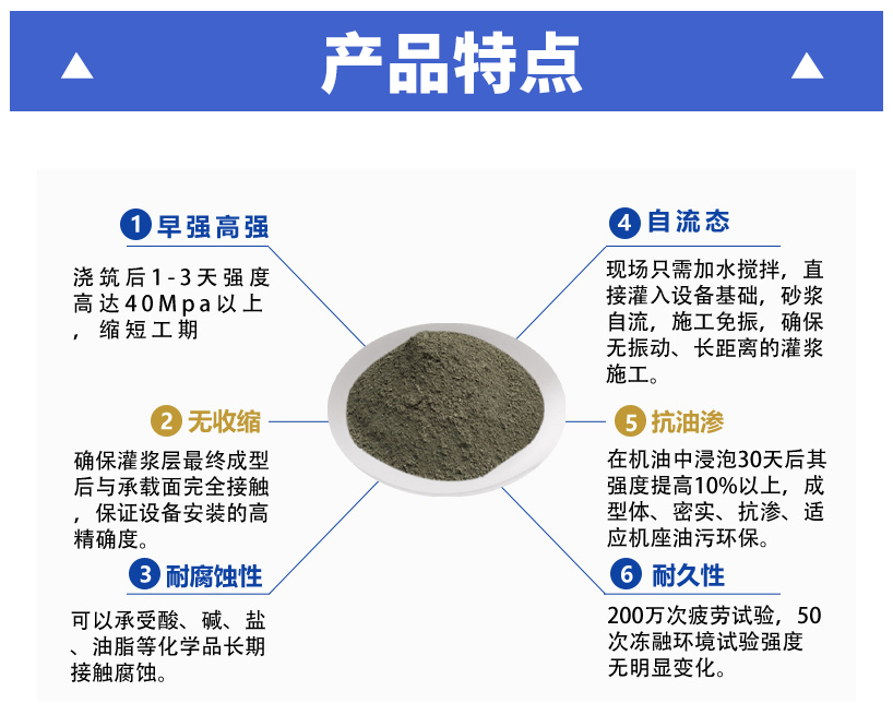 高強無收縮灌漿料是以高強度石英砂作為骨料,以水泥作為結合劑,輔以高流態、微膨脹、防離析等物質配制而成。它在施工現場加入適量的水,攪拌均勻后即可使用。灌漿料具有自流性好,快硬、早強高強、無收縮、微膨脹; 無害、不老化、對水質及周圍環境友好,自密性好、防銹等特點。從根本上改變設備底座受力情況,使之均勻地承受設備的全部荷載,從而滿足各種機械,電器設備(重型設備高精度磨床)的安裝要求,是無墊安裝時代的灌漿材料。